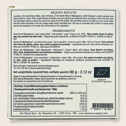 Bertil Åkesson perst in Madagaskar de cacaoboter uit de cacaobonen en maakt vervolgens in Frankrijk deze repen witte chocolade. In tegenstelling tot de meeste witte chocoladerepen, “deodoriseert (ontgeurt)” hij de boter niet. Hierdoor blijven de natuurlijke smaaktonen van de cacaoboter bewaard. Het resultaat is een heerlijke zachte en romige witte chocolade. In deze reep proef je rokerige smaaktonen en echte chocolade, iets wat zeer uitzonderlijk is voor witte chocolade. Als je iets verder zoekt vind je ook iets van karamel en zuivelachtige romige smaaktonen.