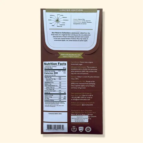 Duik in de verrukkelijke wereld van Auro Chocolate, het authentieke ambachtelijke chocolademerk uit de Filipijnen. De Filipijnen worden terecht geassocieerd met chocolade in Zuidoost-Azië. In de 17e eeuw brachten de Spanjaarden cacao naar de Filipijnen, waardoor het land sindsdien een belangrijke speler is geweest in de cacaoteelt. Auro Chocolate is een ‘bean-to-bar’ bedrijf uit de Filipijnen dat zich specialiseert in het produceren van chocolade rechtstreeks van lokaal ingekochte bonen. Ze gaan zelfs nog verder dan ‘bean-to-bar’ door niet alleen bonen in te kopen, maar ook te produceren in dezelfde regio. De cacao die wordt gebruikt voor deze chocolade komt uit de regio Davao, gelegen op het eiland Mindanao.