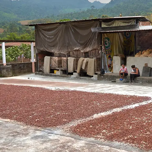 Na het fermenteren is het tijd om de bonen te drogen. Vanwege het tropische klimaat in deze landen kunnen de bonen in de zon worden gedroogd. Het drogen duurt 6 tot 10 dagen en gebeurt vaak op grote betonnen platen die op de grond liggen. Afhankelijk van de financiele middelen hebben sommige boeren houten oprolbare daken of afdaken gebouwd om de bonen te beschermen tegen de elementen, vooral tijdens de moessontijd. Iets dat in deze periode is dat geen overbodige luxe is.